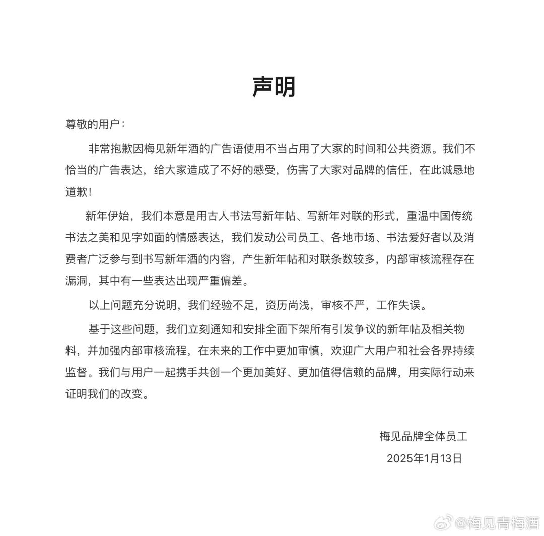 聲明中,梅見酒解釋稱,他們本意是想以古人書法的形式重溫中國的傳統(tǒng)文化,但由于內(nèi)部審核流程的漏洞,導(dǎo)致了一些表達(dá)嚴(yán)重偏差,從而造成了公眾的不適和對品牌信任的傷害。