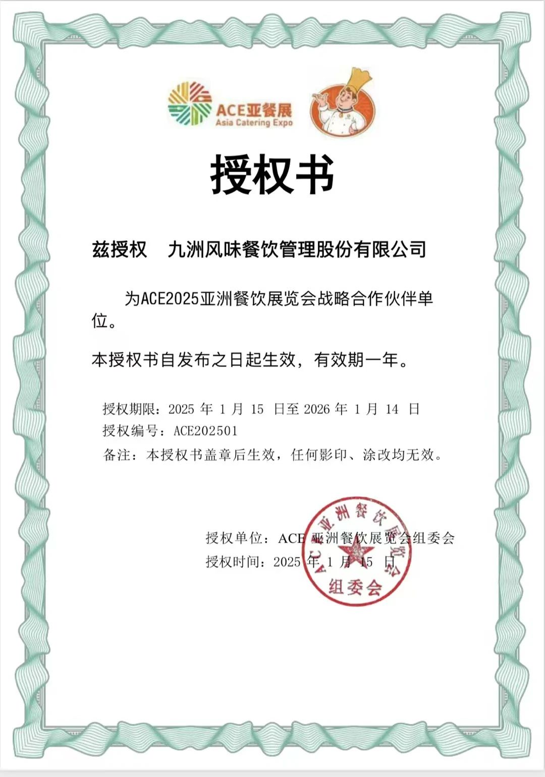 1月19日,ACE亞洲餐飲展覽會(簡稱ACE亞餐展)組委會一行到訪九洲風味餐飲管理股份有限公司(簡稱九洲風味)。雙方就共同做大做強ACE亞餐展達成共識,并將在ACE2025第三屆亞洲餐飲展覽會(簡稱ACE第三屆亞餐展)展開戰(zhàn)略合作。