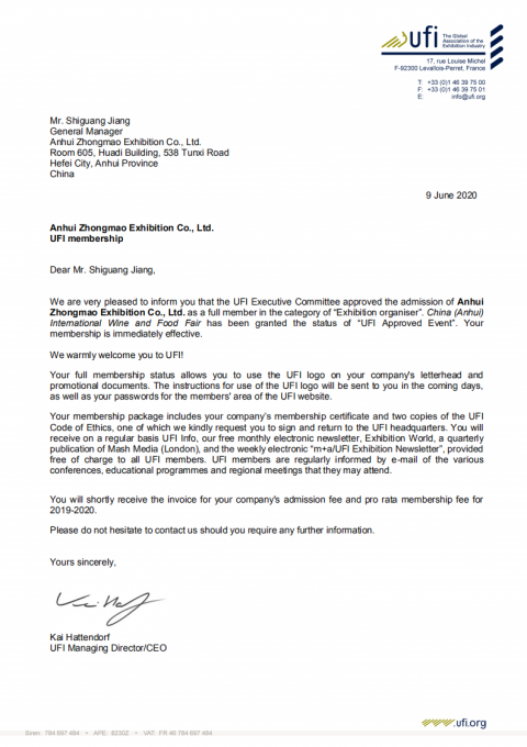 2020年6月9日,UFI(全球展覽業(yè)協(xié)會(huì))巴黎總部傳來(lái)喜訊:中法合資高博中貿(mào)會(huì)展在山東、江蘇、安徽主辦的CNFE全國(guó)食品博覽會(huì)(濟(jì)南)、CNWFF中國(guó)(南京)···